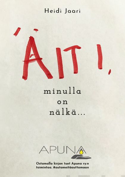 Heidi Jaarin toimittama Äiti minulla on nälkä! -teos kokoaa yksiin kansiin vähävaraisten perheiden sekä yksinäisten avun tarvitsijoiden tositarinoita. Kirja on kirjoitettu niiden lasten äänellä, jotka illalla koettavat saada unta nälästä kurnivasta vatsasta huolimatta, ja jotka kouluun mennessään... Lue lisää