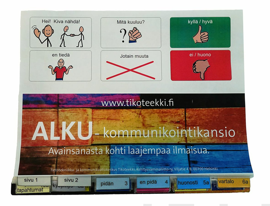 ALKU-kansio sopii mm. lapsille, joille sanastoltaan laaja kansio- ja lausetasoinen ilmaisu on liian vaikeaa. ALKU-kommunikointikansion kuvia käytetään ilmaisun avainsanoina. Kansion sanasto ei sovellu kieliopin mukaisten lauseiden rakentamiseen. Kansiossa on 61 sivua (A4-kokoa), 9 vaihtuvaa kuvaa... Lue lisää
