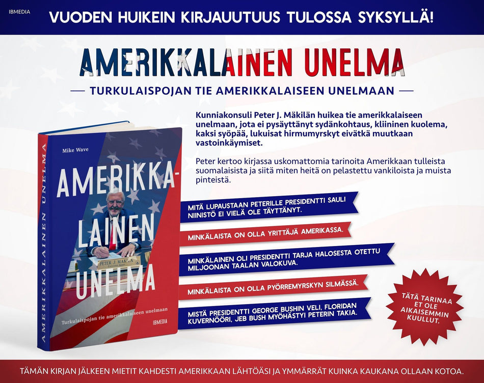 Yrittäjä-kunniakonsuli Peter Mäkilän uskomaton ja pitkä tie amerikkalaiseen unelmaan. Siitä, miten hän nuorena miehenä lähti Atlantin ylitse Amerikkaan vain muutama dollari taskussaan. Matkaa amerikkalaiseen unelmaan ei pysäyttänyt sydänkohtaukset, kuolema, kaksi syöpää, lukuisat hirmumyrskyt eivätkä muutkaan vastoinkäymiset.