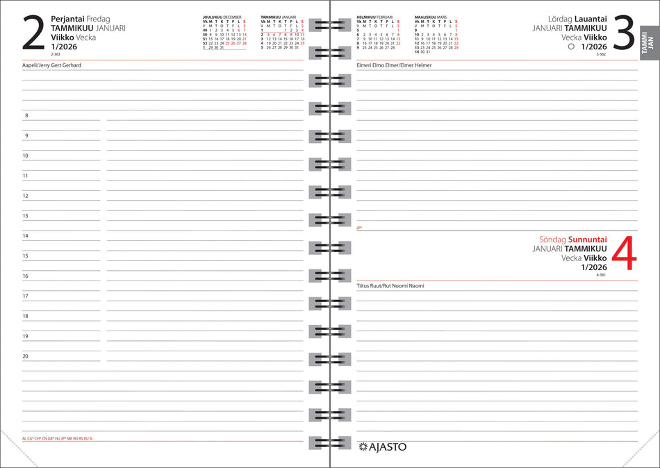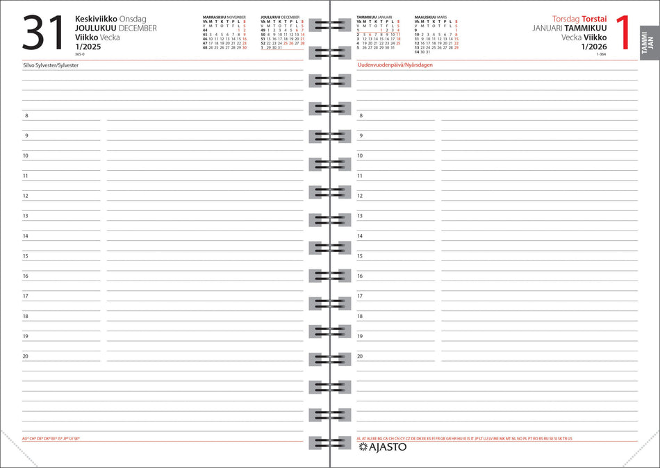 Koko 148 x 210 mm (A5); parikierresidottu; kielisyys: suomi, ruotsi; sivulla päivänäkymä; päiväkirja 52/2025 - 53/2026; vuosisuunnitelmat 2026 ja 2027; kansalliset vapaapäivät; suomalaiset ja suomenruotsalaiset nimipäivät; välimatkataulukko; muistiinpanosivuja; FSC®-sertifioitu tuote.