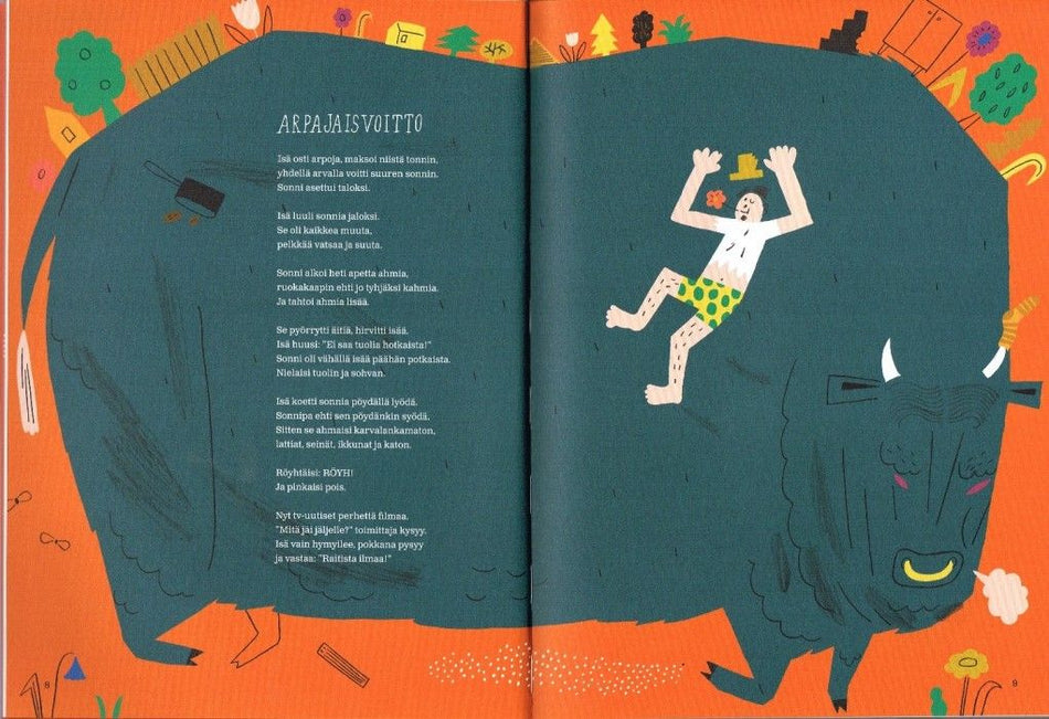 Aprillipäivän loruissa ilakoidaan nonsensen hengessä. Runoja säestää Camilla Pentin riemastuttava kuvitus.