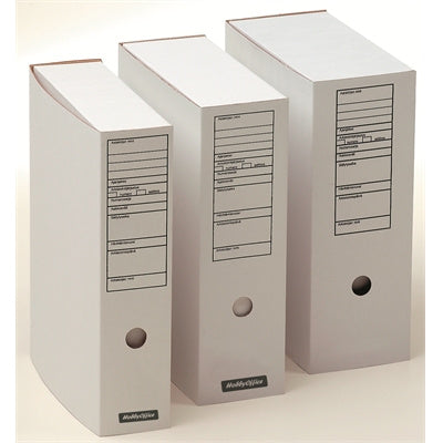 Sivusta aukeava valkoinen arkistokotelo. Päädyssä on painettu etikettiosa. Laatikkoa voidaan säilyttää joko pysty- että vaakasuunnassa.