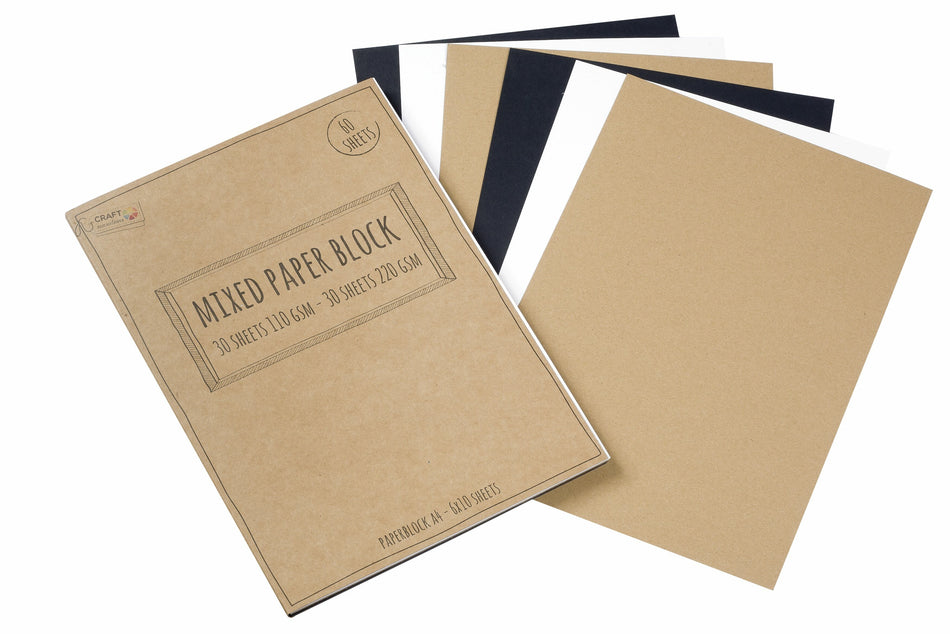 Monipuolinen A4-kokoinen lehtiö jossa 30 arkkia 110gsm paperia valkoisena, ruskeana ja mustana, sekä 30 arkkia 220gsm kartonkia valkoisena, ruskeana ja mustana. 10 arkkia per gsm ja väri, yhteensä 60 arkkia