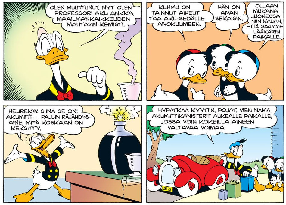 Tarinassa ”Rautamantteli” Aku ja veljenpojat ryhtyvät lumisotasille, arvattavan sekasortoisin seurauksin. ”Leijat” opettaa ankoille, ettei leijanlennättäminen ole vallan vaivatonta puuhaa, ja ”Kilpailevat venemiehet” laittaa Tupun, Hupun ja Lupun nokikkain setänsä kanssa kalastuksen maailmassa. ”Hullu kemisti” puolestaan näyttää, miten käy, kun Aku ryhtyy leikkimään veljenpoikien koeputkilla.