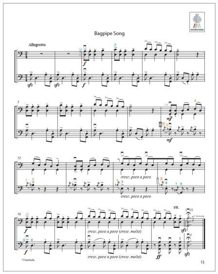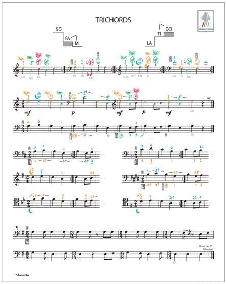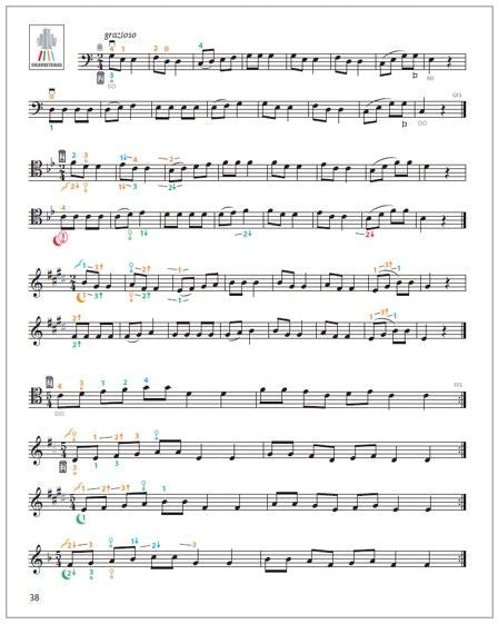 The new element, the minor 2nd interval was introduced by adding the FA and TI notes. Later on these are expanded into the four types of tetrachrods (Major, Minor, Phrygian, Lydian). Melodies based on these tone sets (including folk song arrangements) help develop the students' taste and sense of musical character (which is the foundation for understanding the music of the 20th century). The precise and interesting ngerings aid their sense of pitch.