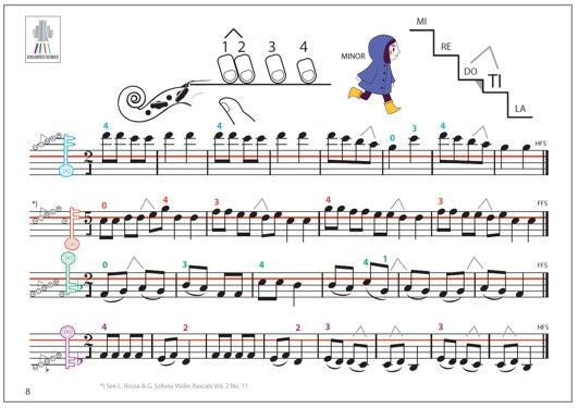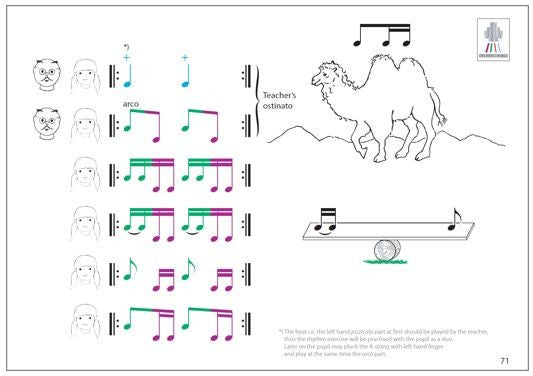 An extensive appendix offers 48 pages of exercises in bow division, rests, bouncing bow, arpeggios and chords. Cut out figures for major and minor to be used as pedagogical tools are specially designed for this book. The figures are present on many pages, helping to build the sense of diatonic scales.