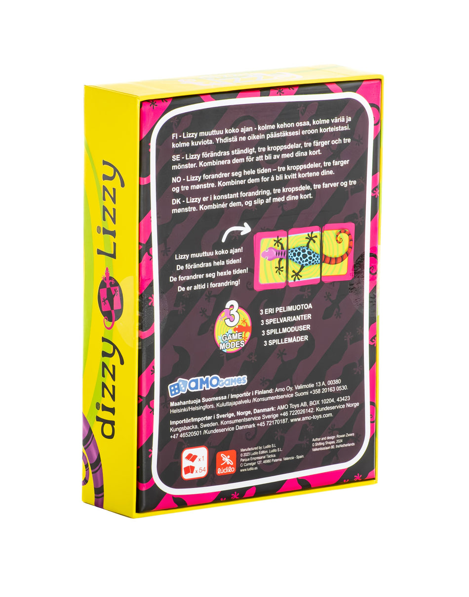 Pysy mukana Dizzy Lizzyn rytmissä! Pelissä on kortteja, joissa on pää-, keskivartalo- ja häntäosia. Yhdistele niistä oikeita yhdistelmiä päästäksesi eroon korteistasi. 1- 9 pelaajalle. Sisältää 3 eri pelivaihtoehtoa. Pelin kesto noin 10 minuuttia.