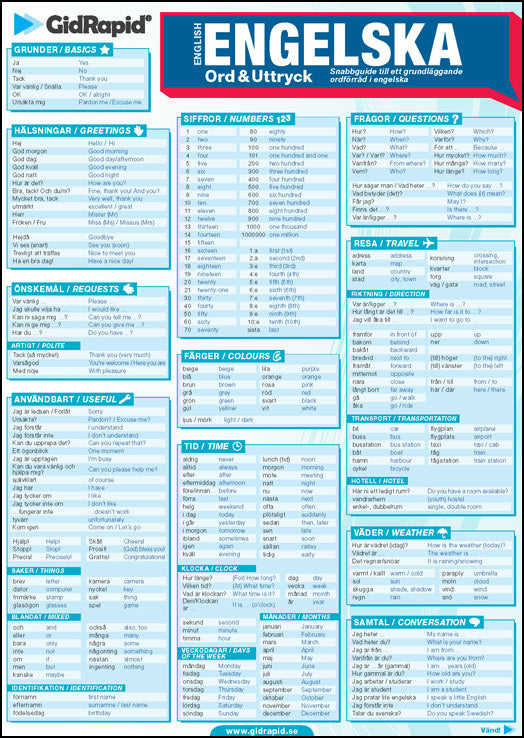Den dubbelsidiga laminerade guiden innehåller: Hälsningsfraser – Siffror & Ordningstal – Tidsuttryck & Resa – Mat & Nöjen – Hem & Skola – Väder & Natur – Kropp & Hälsa – Frågeord, Adjektiv & Verb – ...och mycket mer!