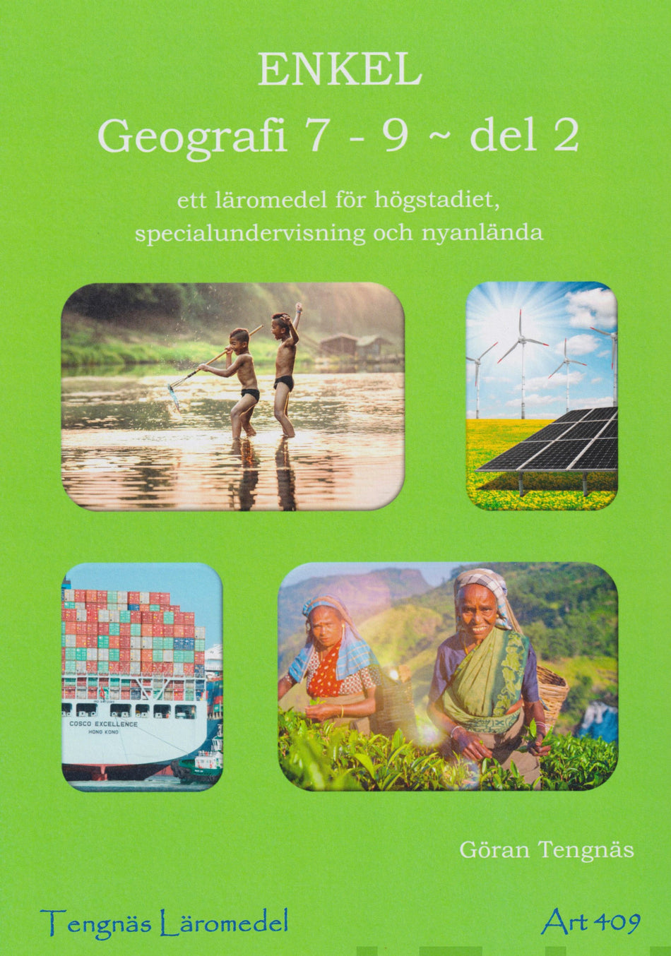 I läromedlet ENKEL Geografi 7-9, del 2 behandlas; Europ vår egen världsdel, Varor och tjänster, Handel, Transporter och kommunikation, Energi, Hållbar utveckling, Jordens befolkning, Migration och urbanisering, Rika och fattiga länder, Sårbarhet och Några länder i världen (USA, Ryssland, Kina, Japan, Indien, Brasilien och Nigeria).