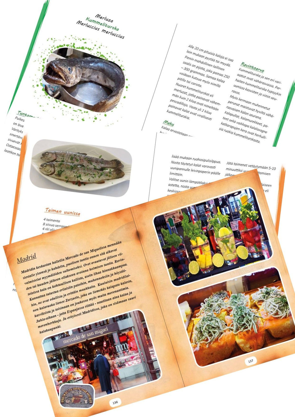 Selkeiden ruokaohjeiden ja upeiden kuvien lisäksi tarjolla on kalaisia tarinoita Andalusiasta ja Madridista sekä kalastajien kertomuksia. Lukija otetaan myös mukaan espanjalaiseen joulupöytään ja turskakauppaan. Kalat ovat kansainvälistä herkkua, joilla ei ole maantieteellisiä rajoja. Kirja sopii matkakirjaksi, ravintolaoppaaksi sekä kotikeittiössä käytettäväksi. Esittelyssä 30 kalalajia tuntomerkkeineen sekä kirjaa varten kokeillut ruokaohjeet. Mukana suomalaiset, latinalaiset ja espanjalaiset kalalajiennimet. EU:n suositukset mm. kalan pakastamisesta sushin valmistuksessa ovat kirjan antamaa ruokaturvallisuutta parhaimmillaan. Hiilijalanjälki ja ekologisuus painottuvat kalavalintojen esittelyssä.