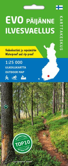 Ulkoilukartta Evo Päijänne Ilvesvaellus 1:25 000 on painettu vedenkestävälle synteettiselle materiaalille. Uudet kestävät kotimaiset ulkoilukartat tunnistaa kannen keltaisesta merkinnästä.