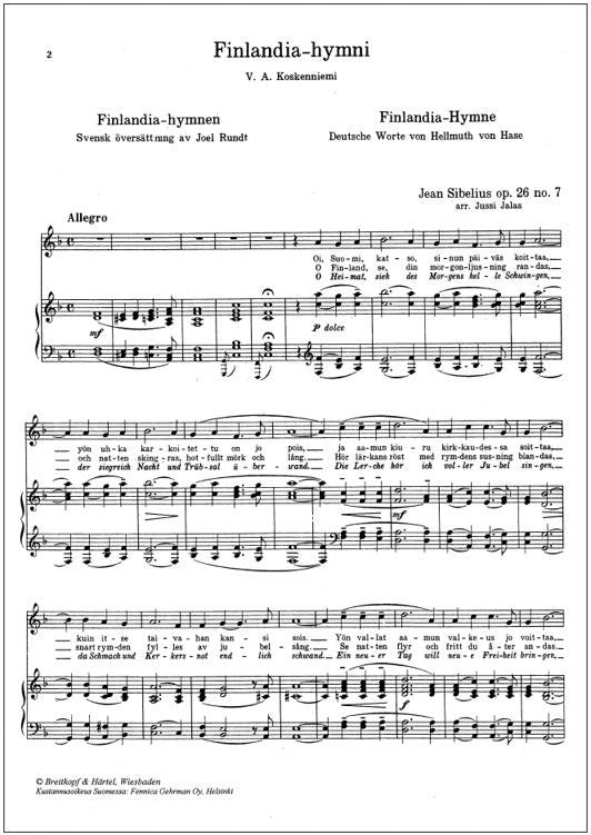 Jussi Jalas' arrangement for voice and piano of Jean Sibelius' Finlandia-hymni op. 26/7. Singable translations in Swedish and in German. Lue lisää