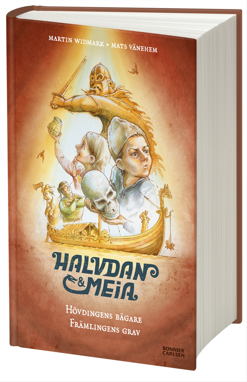 Den här samlingsvolymen innehåller de två första fristående äventyren om Halvdan och Meia, nu med bilder i färg. I"Hövdingens bägare" står Öst- och Västbyn på randen till krig och allt hänger på att Halvdan och Meia lyckas få de två hövdingarna att de är bäst - båda två. I "Främlingens grav" berättar legenden om en gömd skatt som Halvdan måste hitta för att rädda sin by. Tyvärr är han inte den enda som letar efter den ...