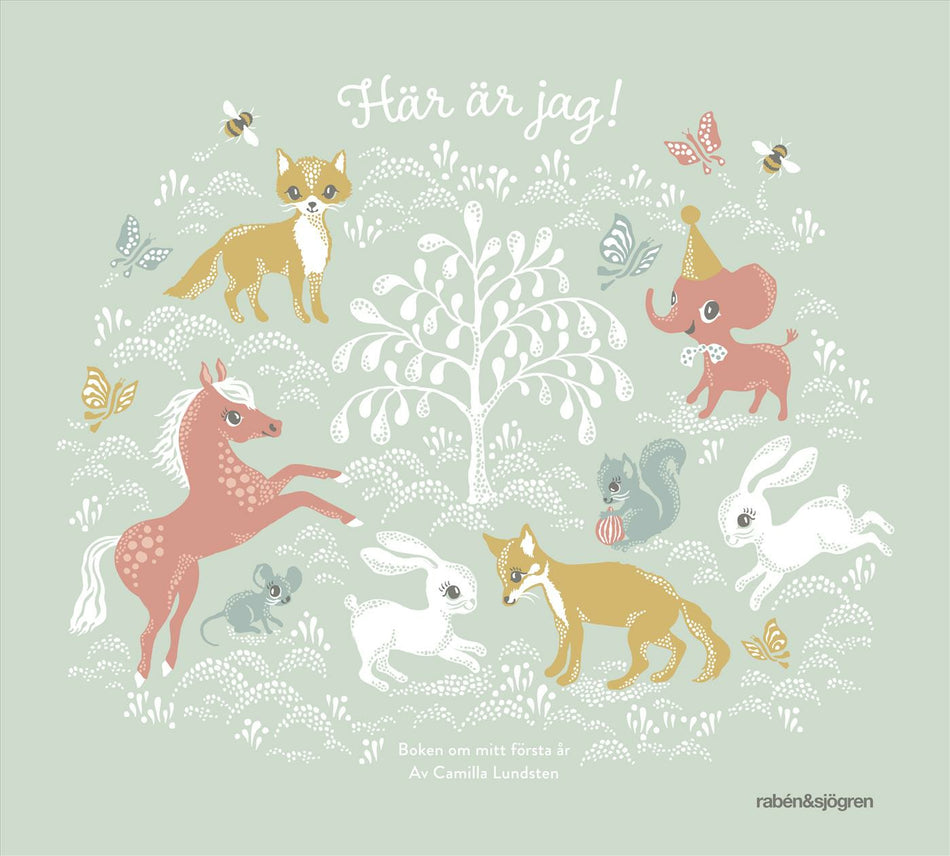 I Här är jag! finns en härlig variation av noga utvalda mönster som ligger som färdiga tapetväggar att dekoreras med fotografier och minnen. Allt från Camilla Lundstens välkända signummönster till den senaste mönsterkollektionen. Här finns alla viktiga milstolpar med under barnets första levnadsår och det följer med ett stort kuvert längst bak i pärmen att lägga små minnesvärda saker i.