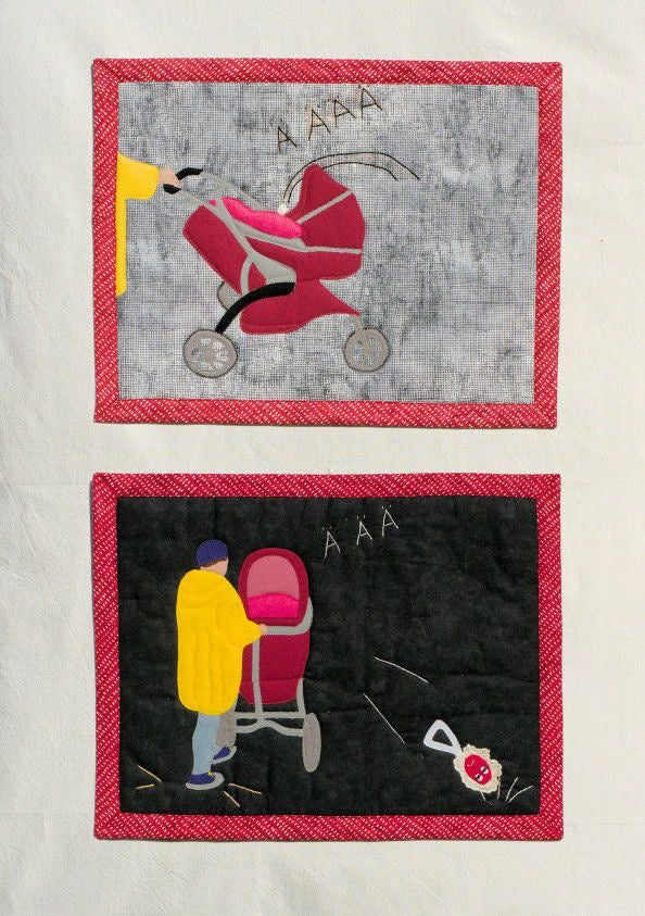 Sen jokainen ruutu on toteutettu kankaista applikoimalla ja käsin koristelemalla. Materiaalien vaihtelu, helmet, nauhat, kirjonnat ja muut yksityiskohdat pysäyttävät kuvien äärelle ja jättävät ajatukselle sekä tarinan pohdinnalle tilaa.
