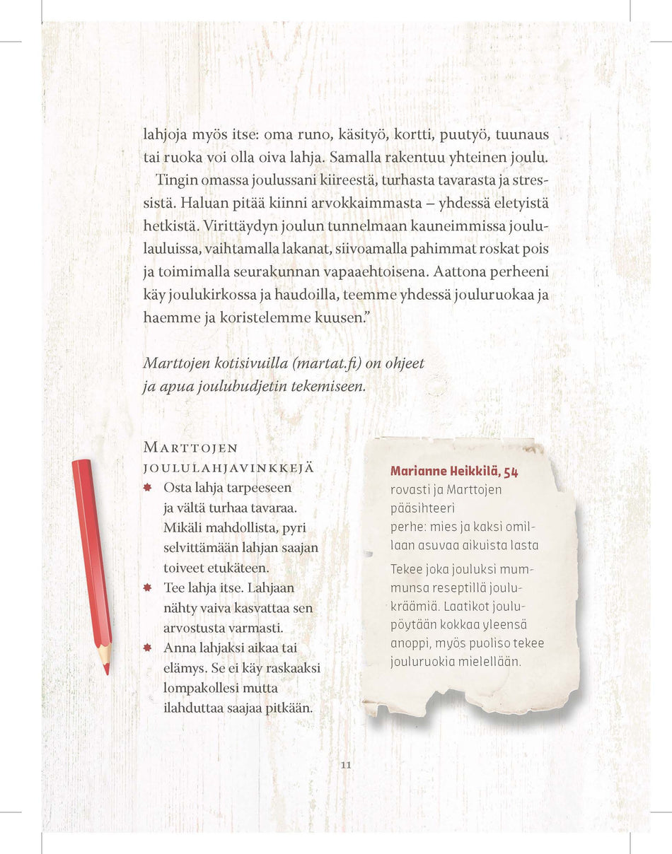 Kirjassa jouluvinkkinsä jakavat muun muassa: Anu Pentik, Valtteri Torikka, Anne Kukkohovi, Paola Suhonen, Matti Mattson, Marianne Heikkilä, Anneli Kanto, Kari Kanala, Hans Välimäki Ja Riitta Uosukainen.