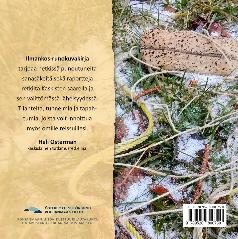 Ilmankos-runokuvakirja tarjoaa hetkissä punoutuneita sanasäkeitä sekä raportteja retkiltä Kaskisten saarella ja sen välittömässä läheisyydessä. Tilanteita, tunnelmia ja tapahtumia, joista voit innoittua myös omille reissuillesi. Tekstit ja valokuvamateriaalit vuorottelevat läpi koko teoksen. Heli... Lue lisää