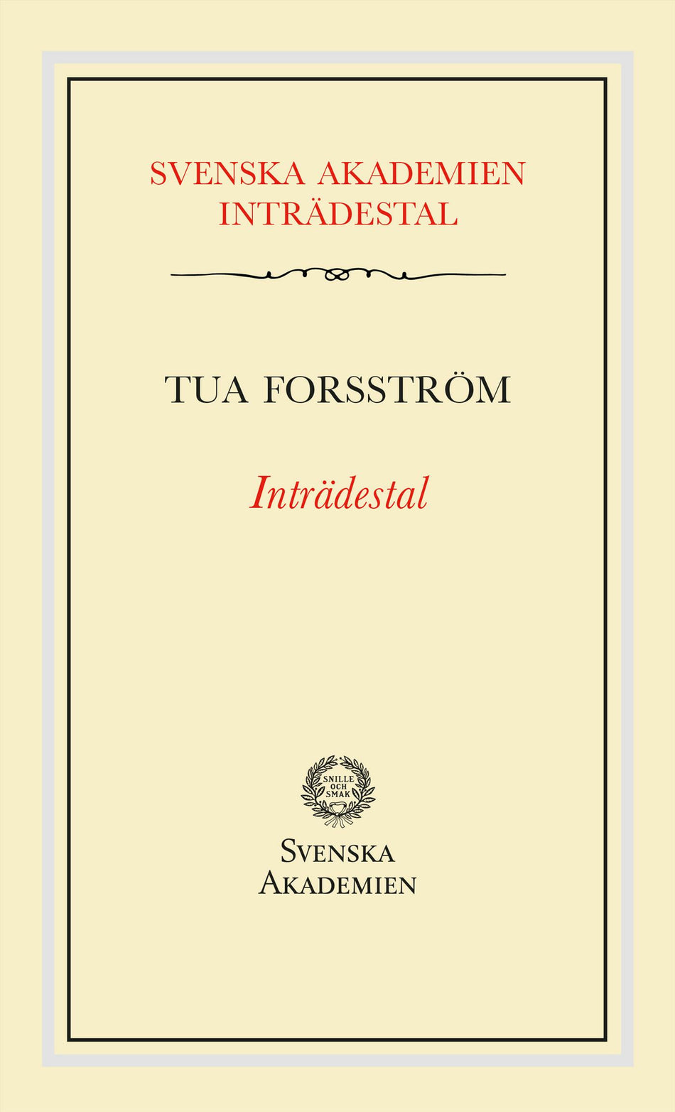Vid Svenska Akademiens högtidssammankomst den 20 december 2019 tog Tua Forsström sitt inträde i Svenska Akademien. Hon efterträdde Katarina Frostenson på stol nummer 18. Detta är Tua Forsströms inträdestal. Lue lisää