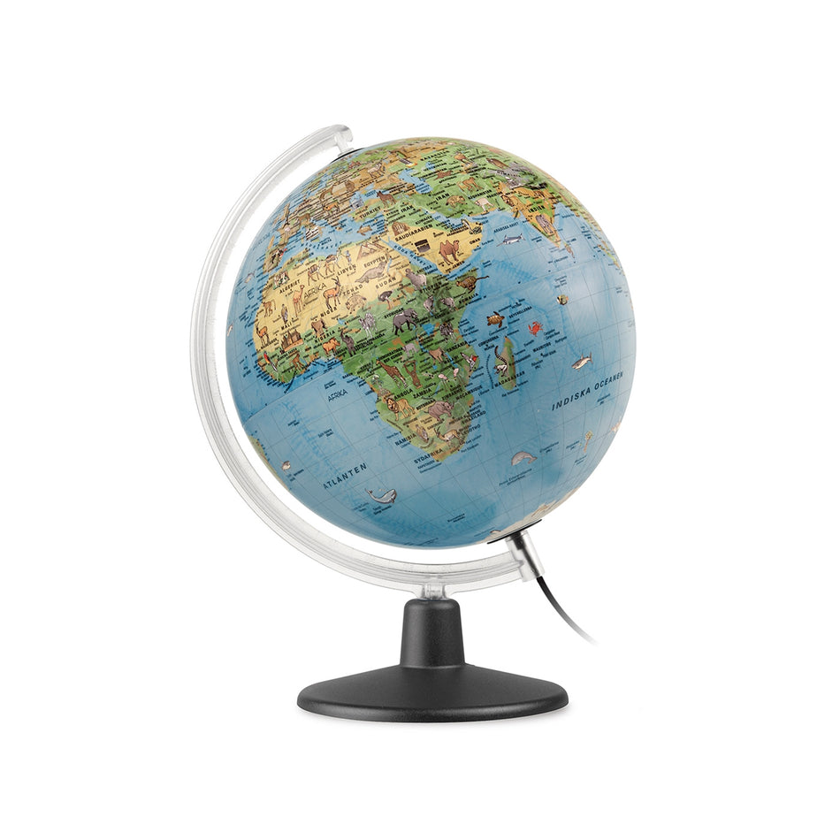 Jordglob 30cm diam. med belysning. Fot i svart plast och meridian i frostad plast. Illustrerad kartbild som visar djur och kända landmärken. Svensk text. Lue lisää