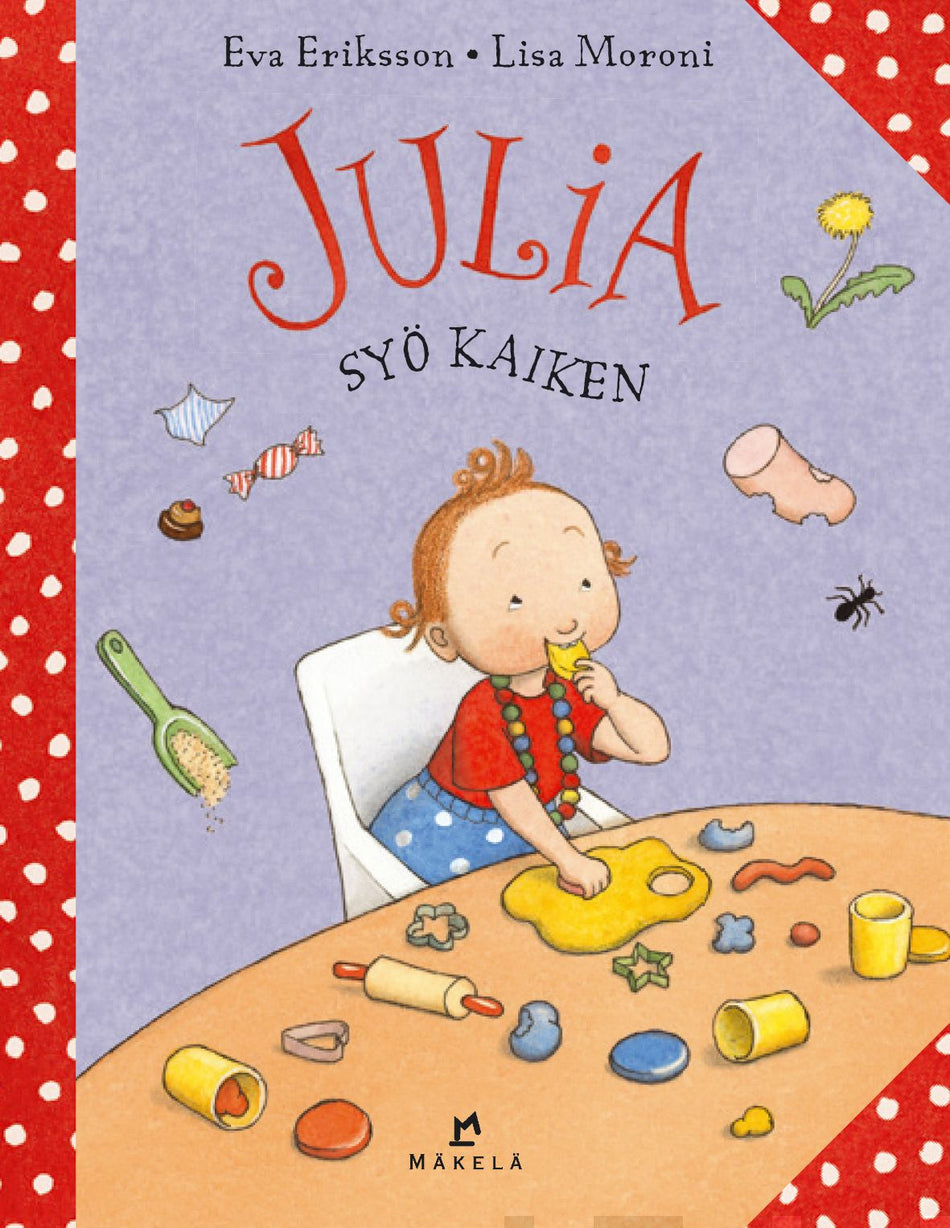 Julia on virkeä, kekseliäs ja aina valmiina leikkiin, niin kuin kaksivuotiaat tapaavat olla. Tässä kirjassa Julia haluaa maistaa kaikkea: hiekkaa, voikukkia, muovailuvahaa ja Sooda-koiran muonaa. Kun mummu saa oikean ruoan valmiiksi, Julian masu on aivan täynnä. Mutta jälkiruoka saattaisi maistua!