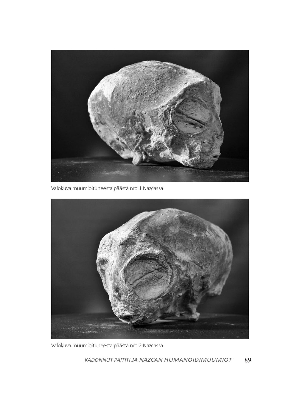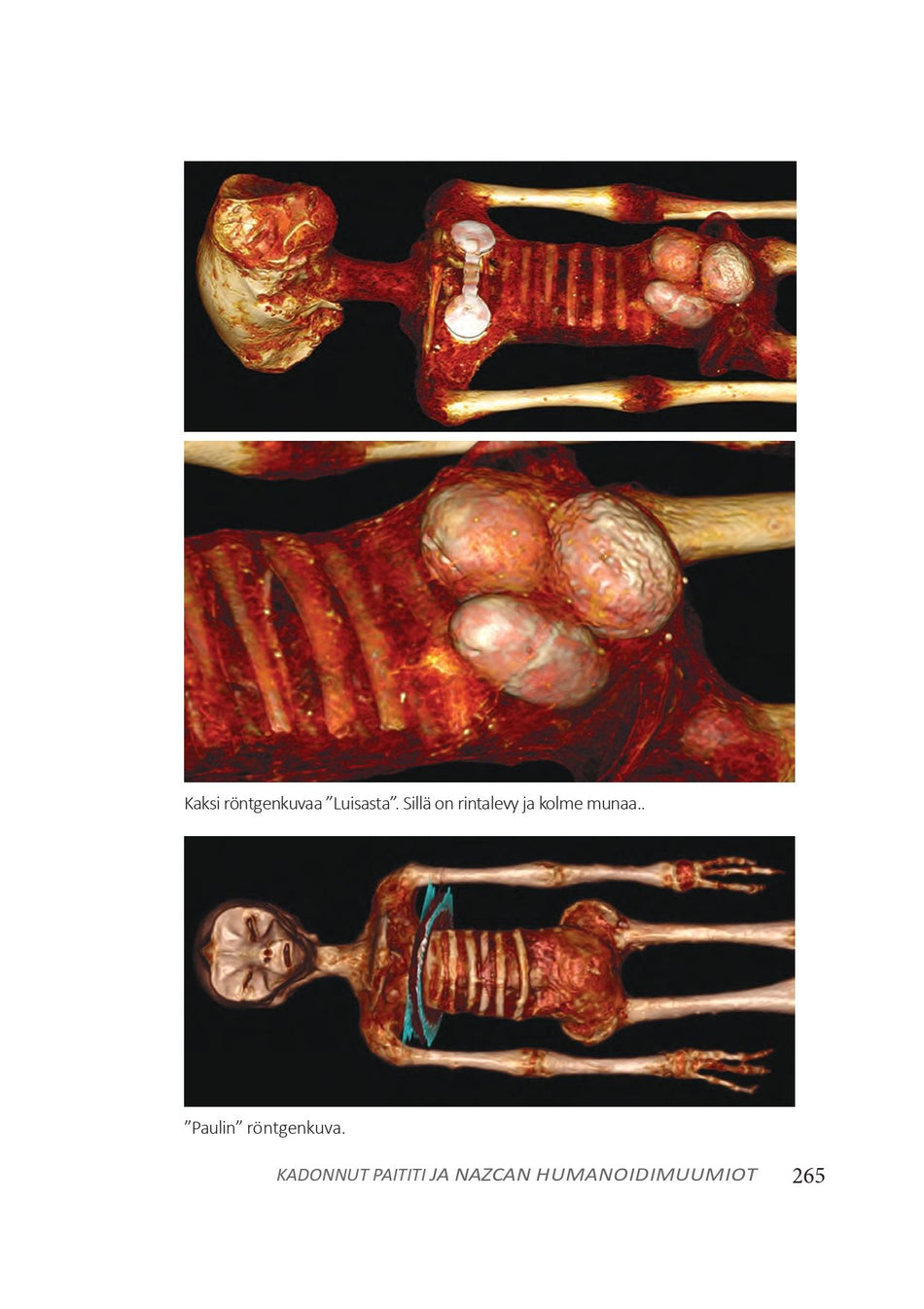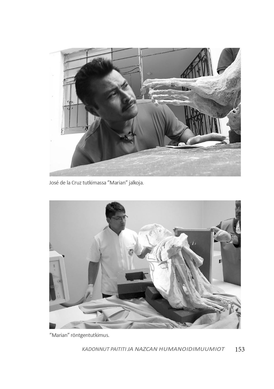 Kirjasta löytyy kuvia omituisista jäänteistä, kuten kolmisormiset pitkät kädet, joissa on humanoidille tyypilliset kynnet. Kirjassa kerrotaan muumion käsien yläosassa olevista salaperäisistä pyöreistä metallilevyistä, joissa on kiinnostavia timantin- tai pisaranmuotoisia geometrisiä kuvioita, ja tutkitaan myös selittämättömiä ohuesta ja rypistymättömästä metallista valmistettuja implantteja, joita on löydetty muumioiden ruumiista.