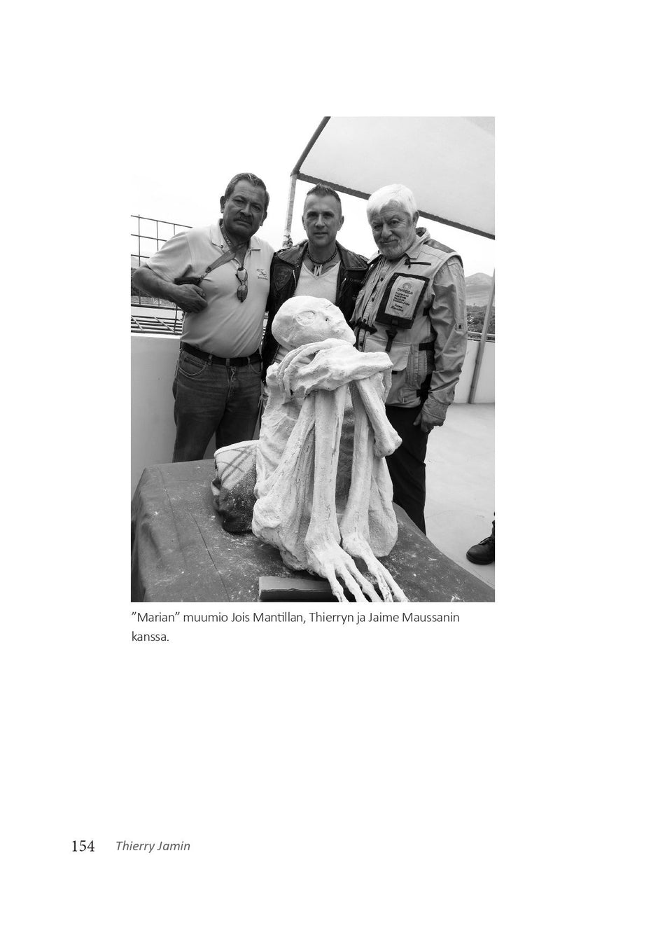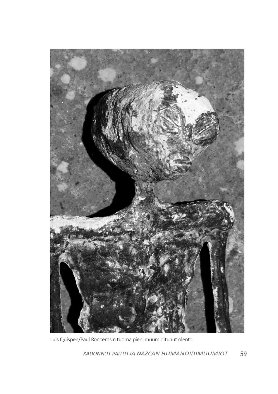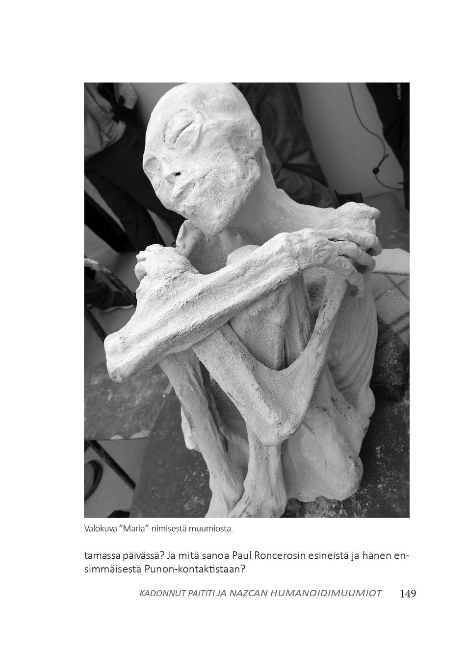Kirjasta löytyy kuvia omituisista jäänteistä, kuten kolmisormiset pitkät kädet, joissa on humanoidille tyypilliset kynnet. Kirjassa kerrotaan muumion käsien yläosassa olevista salaperäisistä pyöreistä metallilevyistä, joissa on kiinnostavia timantin- tai pisaranmuotoisia geometrisiä kuvioita, ja tutkitaan myös selittämättömiä ohuesta ja rypistymättömästä metallista valmistettuja implantteja, joita on löydetty muumioiden ruumiista.