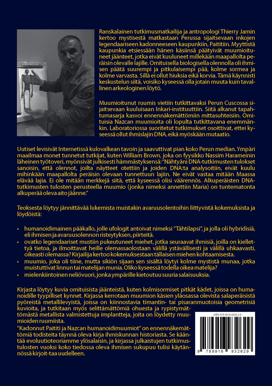 ”Kadonnut Paititi ja Nazcan humanoidimuumiot” on ennennäkemättömiä todisteita täynnä oleva kirja ihmiskunnan historiasta. Se kääntää evoluutioteoriamme ylösalaisin, ja kirjassa julkaistujen tutkimustulosten vuoksi koko tiedossa oleva ihmisen sukupuu tulisi käytännössä kirjoittaa uudelleen.
