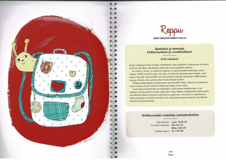 Kokoelmallinen täysin uusia muskarilauluja ilmestyy syksyllä! Laulut on jaoteltu vuoden kulun mukaan 10 teemaan: omena, reppu, siipi, tähti, talli, kello, tunturi, aurinko, ötökkä ja kala.