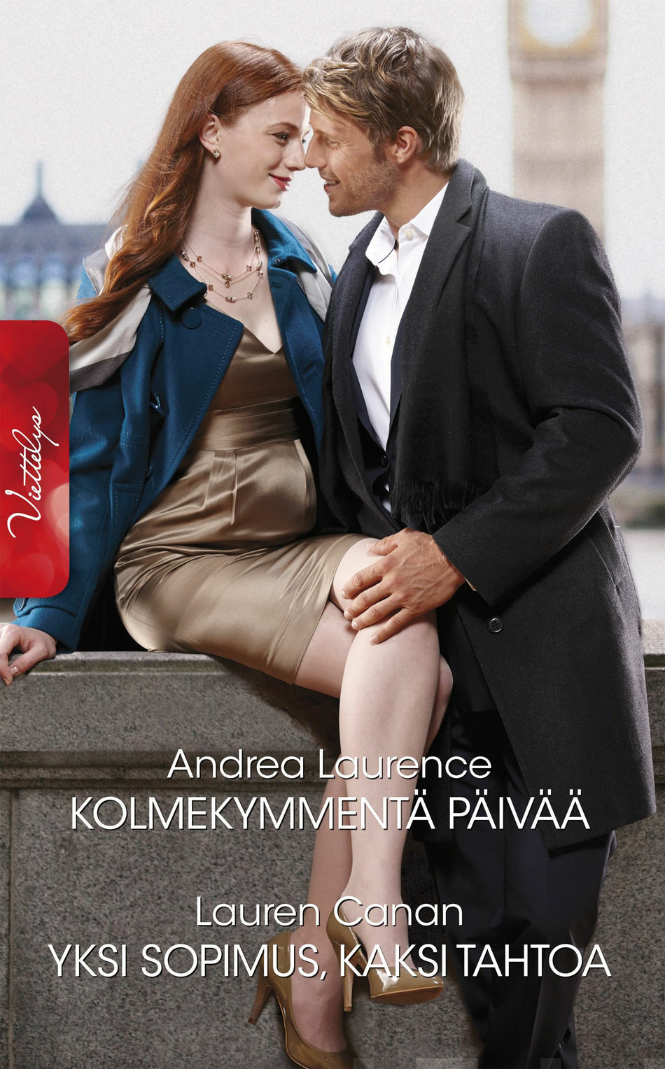Kolmekymmentä päivää Oliko kamalampaa kliseetä kuin humalaiset pikahäät Las Vegasissa? Ja pappina Elvis-klooni ja sulhasena... paras ystävä! Amelia pudisteli typertyneenä päätään. Hän oli haaveillut pikkutytöstä saakka suurista häistä, upeasta valkoisesta puvusta ja Siitä Oikeasta. Tyler ei todellakaan ollut Se Oikea! Tyler oli... No, komea. Ja menestynyt. Ja sai hänet nauramaan. Amelia rakasti Tyleria, mutta hän ei ollut rakastunut. Hän halusi eron. Mahdollisimman nopeasti. Mikään ei muuttaisi hänen mieltään. Ei edes ärsyttävä aamupahoinvointi... Yksi sopimus, kaksi tahtoa Shea ei voinut uskoa, että kaksisataa vuotta vanhan sopimuksen ehdot olivat yhä päteviä. Jos hänellä ei olisi kuun loppuun mennessä aviomiestä, hän menettäisi karjatilansa! Kuinka naurettavaa! Ja koko sotkun takana oli ärsyttävän ylimielinen Alec Morreston, joka halusi rakennuttaa tontille kerrostaloja tai ostoskeskuksen tai jotain muuta yhtä typerää. Mutta Shealla oli vielä viimeinen ässä hihassaan. Sopimuksen ehtojen mukaan Alecin olisi joko suostuttava Shean kosintaan tai jatkettava tontin vuokrasopimusta. Kaupunkilaiskeikari tuskin suostuisi muuttamaan vuodeksi lehmien ja hevosten keskelle! Shea näki jo mielessään Alecin kauhistuneen ilmeen...!