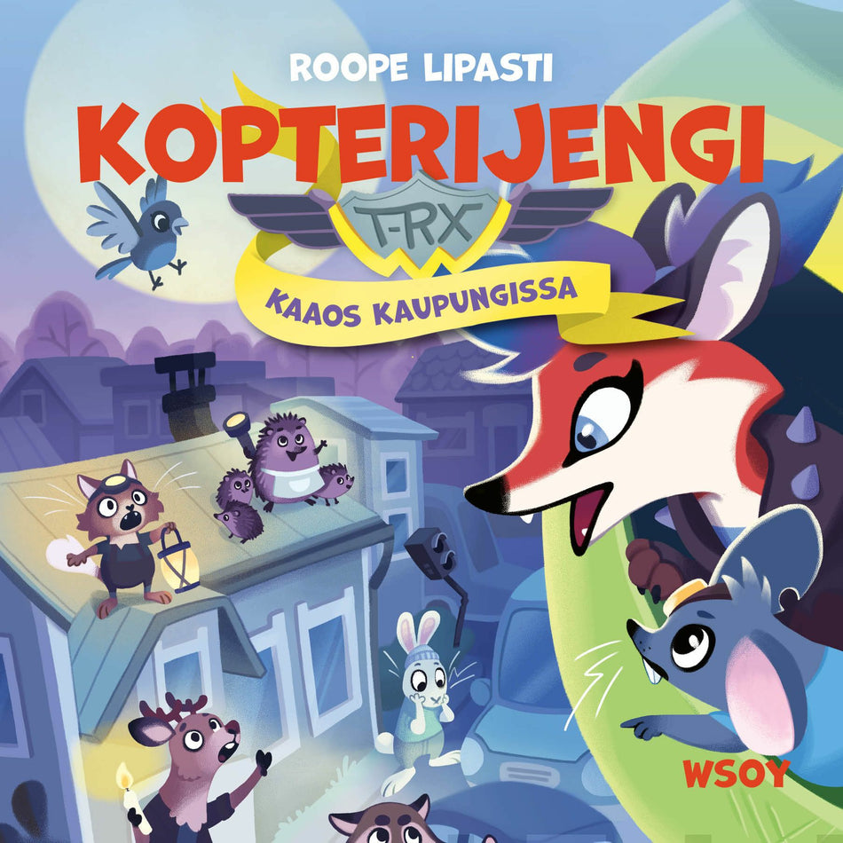 Kopterijengin kotikaupungissa voimalaitos ei toimi niin kuin pitäisi. Kun pelastajat tutkivat tilannetta, selviää, että oravaperhe on tehnyt pesänsä voimalan uumeniin. Mutta voi: pelastustehtävä menee pieleen! Kopterijengi saa aikaiseksi hirmuisen oikosulun, ja koko kaupunki pimenee. Toimimasta lakkaavat niin jäätelökauppiaan pakastin kuin kaikki liikennevalot, ja edessä on täysi kaaos. Tästä pelastustehtävästä tulee paitsi hurjan vaarallinen, myös pilkkopimeä! Kopterijengi T-RX on kuvakirjasarja täynnä huumoria, vauhtia ja vaaratilanteita, ja se sopii kaikille seikkailijoille sukupuolesta riippumatta.