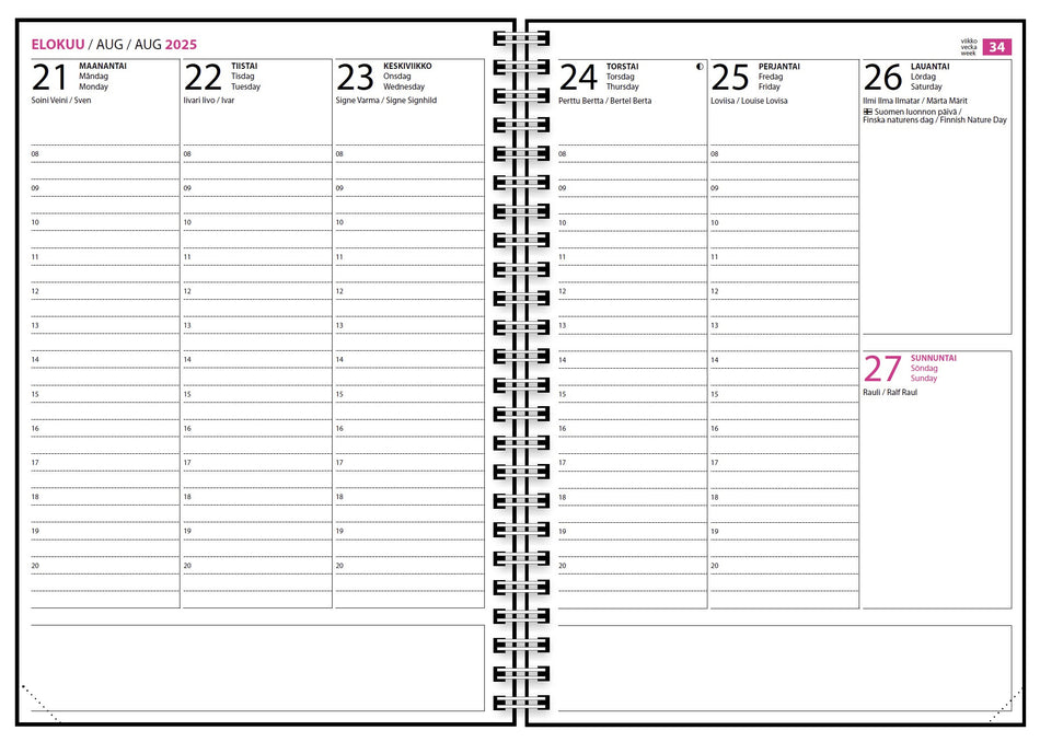 Vallila kalentereissa on upeat designit ja tukevat kartonkikannet parikierresidonnalla. Painatus myös sisäkansissa. Sisältö on 18kk laajuinen viikkoaukeama, eli alkaa kesästä 2025 ja päättyy vuoden 2026 loppuun. Kaksikielinen: suomi ja ruotsi. Ominaisuuksia: vuosikalenteri, lukujärjestys, koetulo... Lue lisää