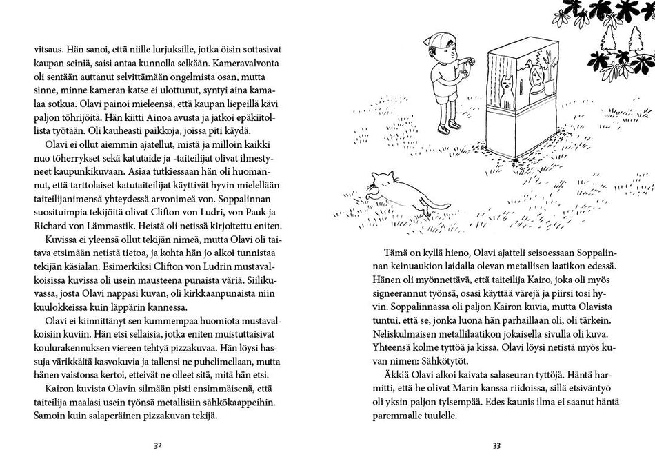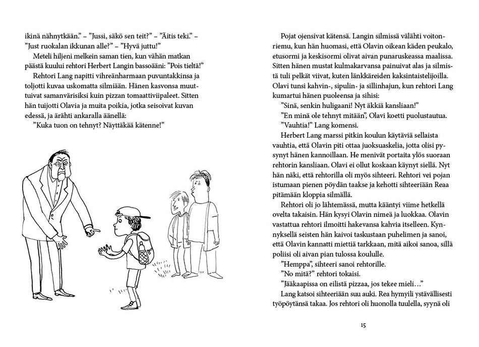 Soppalinnan kouluruokalan ikkunan alle on ilmestynyt ilman lupaa maalattu katutaideteos. Se on kuva pizzasta ja Suomen lipusta. Jännittävä tarina alkaa, kun Olavi sattuu kokeilemaan sormellaan kuvaa nähdäkseen, ovatko sen värit jo kuivaneet. Rehtori tulee kuitenkin juuri silloin paikalle, ja Olav... Lue lisää