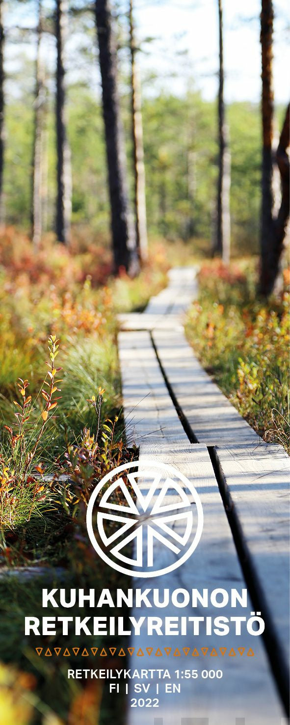 Kuhankuonon retkeilyreitistön retkeilykartta 2022 1:55 000 on ajantasainen maasto- ja reitistökartta. Kartan tuotto käytetään reitistön huoltoon ja kunnostukseen.