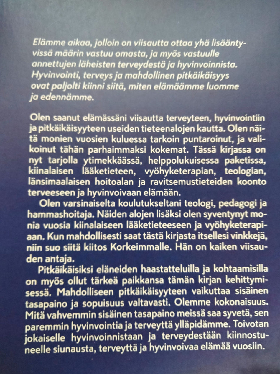 Olen saanut elämässäni viisautta terveyteen, hyvinvointiin ja pitkäikäisyyteen useiden tieteenalojen kautta. Olen näitä monien vuosien kuluessa tarkoin puntaroinut ja valikoimat tähän parhaimmaksi kokemat. Tässä kirjassa on nyt tarjolla ytimekkäässä ja helposti ymmärrettävässä paketissa kiinalaisen lääketieteen, vyöhyketerapian, teologian, länsimaisen hoitoalan ja ravitsemustieteiden koonto terveeseen ja hyvinvoivaan elämään.