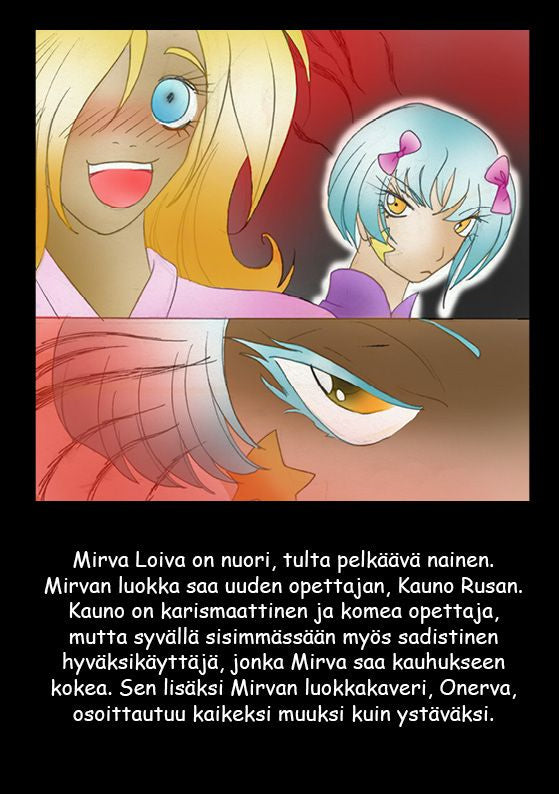 Mirva Loiva on nuori, tulta pelkäävä nainen, joka kauhukseen saa uuden opettajan, Kauno Rusan. Kauno on karismaattinen ja komea opettaja, mutta syvällä sisimmässään myös sadistinen hyväksikäyttäjä. Sen lisäksi Mirva joutuu kestämään eloa ystävänsä Onervan kanssa, joka paljastuu kaikeksi muuksi ku... Lue lisää