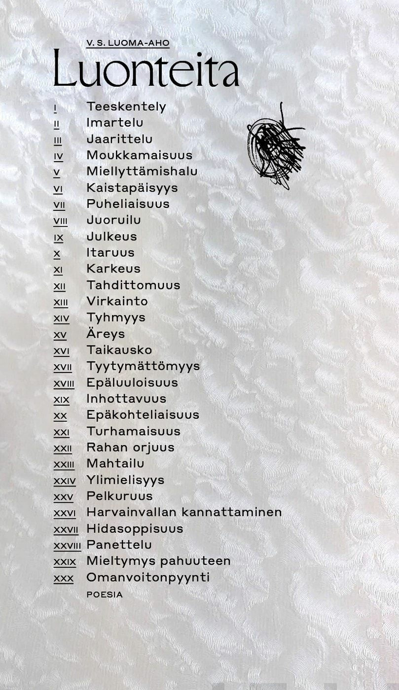 V.S. Luoma-aho on koostanut vuosien varrella keräämistään havainnoista kokoelman ihmisluonteiden kuvauksia, jotka ovat yhtä aikaa niin ajankohtaisia kuin ikiaikaisia. Luoma-aho uuttaa tarkoista ja lakonisista havainnoistaan vapauttavaa satiiria, joka tihkuu tekstikokoelman lauseista suoraan lukijansa nauruhermoon. Luoma-ahon Luonteita päivittää ja ylikirjoittaa antiikin Kreikassa eläneen Theofrastoksen kirjoittaman Luonteita-teoksen (suom. Pentti Saarikoski). Teoksen tekstejä rytmittää, kommentoi ja täydentää maamme eturivin nykytaiteilijoihin kuuluvan Jaakko Pallasvuon kuvitus.