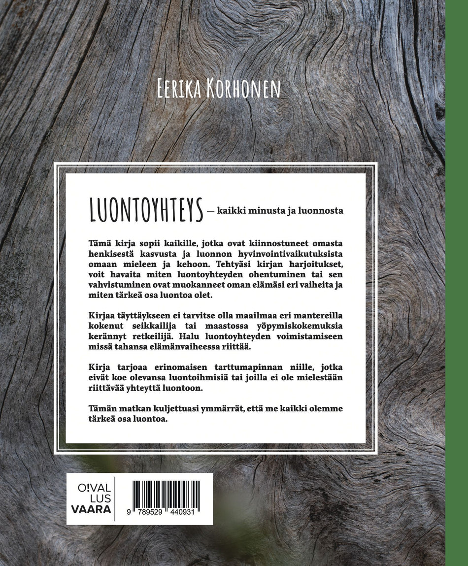 Kirjan puhuttelevien tehtävien avulla voit havaita, miten luontoyhteys on muokannut oman elämäsi eri vaiheita ja miten tärkeä osa luontoa olet.