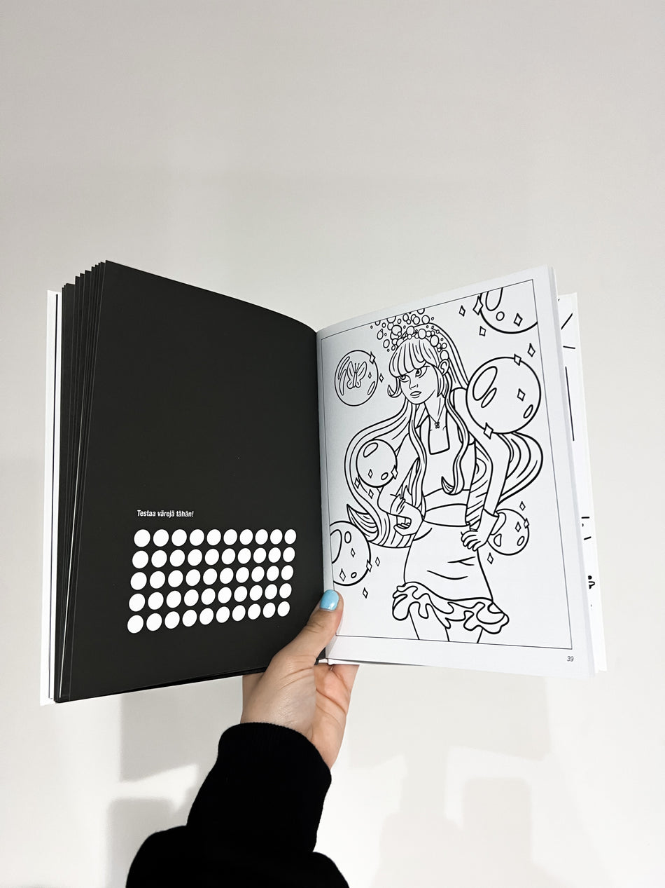 Mukana on yli kaksikymmentä aivan uutta värityskuvaa. Pääset seikkailemaan avaruudessa, luomaan omia värikarttoja ja tekemään Nellin laatimia kivoja väritystehtäviä. Tartu väreihin ja hyppää Nellin maailmaan! Kun täytät kirjaa, siitä tulee vähitellen oma ainutlaatuinen taideteoksesi.