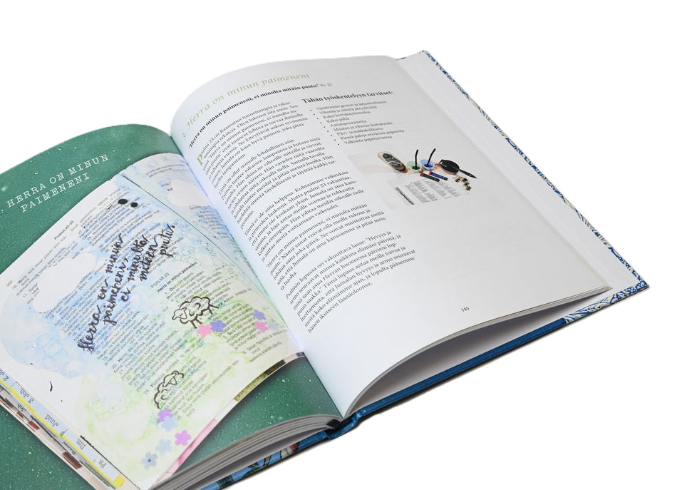 Bible journaling sopii kaikille – yksin tai ryhmässä toteutettavaksi. Innostu ja anna tuttujen jakeiden puhua uudella tavalla!