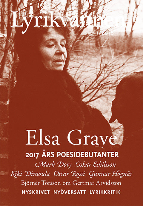 Det här numret av Lyrikvännen handlar om dig och din poesi. Du skulle fyllt 100 i år och det ska såklart firas och uppmärksammas med nyutgåvor av dina verk, tidskriftsnummer och annat festligt, men egentligen vill jag uppmärksamma dig varje dag. Du som gick din egen väg redan från debuten med Inkräktare 1943 och som fortsatte vara egen genom hela ditt författarskap: i arton diktsamlingar, fem prosaböcker och ett tiotal dramer. Du som skrev om fläsk, navelsträngar, spenar, spindlar och skräck som ingen annan, vilket fick många (manliga) kritiker att tro att du skrev utifrån ”en modern kvinnlig problematik”. Men riktigt så enkelt var det ju inte, Elsa. ”Hon låter sin trojanska ponnyhäst trava in och charma de manliga kritikerna med sina konster medan den feministiska kritiken sipprar ner i bjälklaget”, skriver litteraturvetaren Annelie Bränström-Öhman i den personliga hyllning till dig som inleder numret. Knivskarpt, och stundtals vansinnigt roligt, berättar hon om genus-Tourettes, dockhemsk verklighet och din pseudonym Androgyna Dämona Gravida-Grave. Men framför allt skriver hon om dig, Elsa – poeten Elsa Grave på tvärs med genuskontraktet.