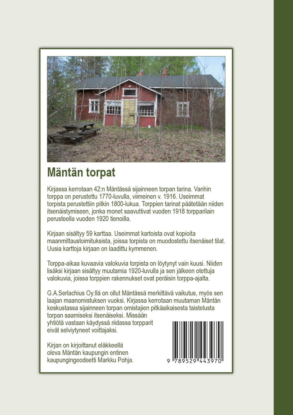 Kirjassa kerrotaan 42:n Mäntässä sijainneen torpan tarina. Vanhin torppa on perustettu 1770-luvulla, viimeinen v. 1916. Useimmat torpista perustettiin pitkin 1800-lukua. Torppien tarinat päätetään niiden itsenäistymiseen, jonka monet saavuttivat vuoden 1918 torpparilain perusteella vuoden 1920 ti... Lue lisää
