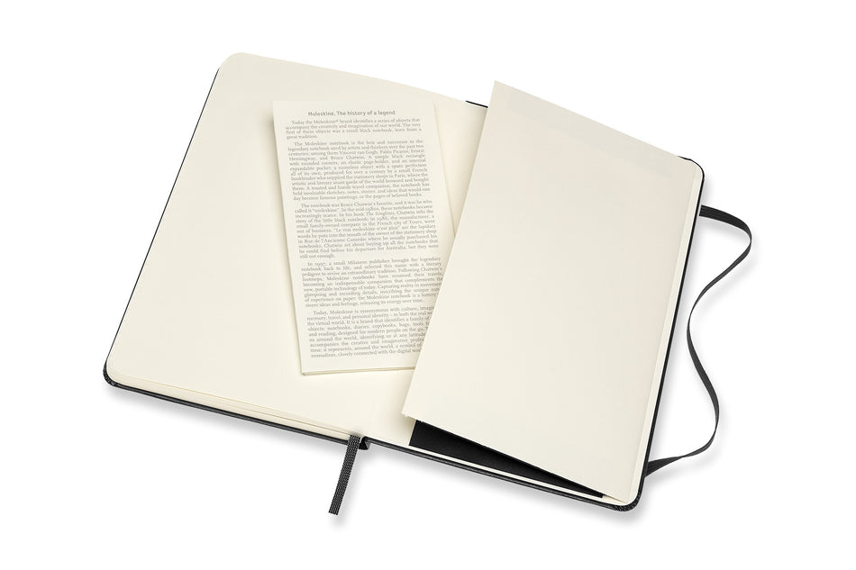 This Moleskine Hardcover Medium Ruled Black Notebook has rounded corners and an elastic closure. Featuring 208 ivory-coloured acid-free 70gsm pages, thread bound, and an expandable inner pocket made of cardboard and cloth. Includes a ribbon bookmark, an 'in case of loss' notice, and a removable l... Lue lisää