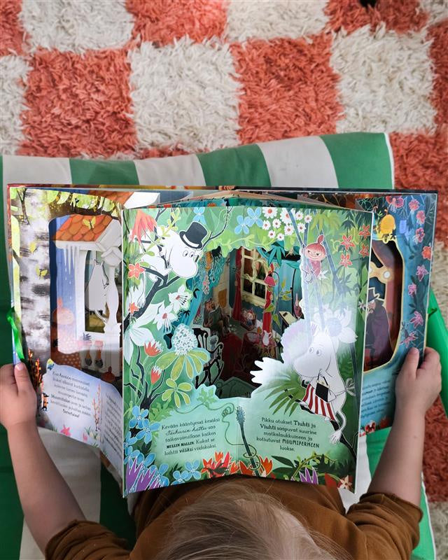Tämä vaikuttava luomus juhlistaa teemallaan muumitarinoiden 80-vuotisjuhlavuotta ja on mitä oivallisin lahja kaikenikäisille muumien ystäville! Kirjan jokaisella aukeamalla avautuu monikerroksinen näyttämökuva, ja kokonaisuutena avautuessaan kirjasta muodostuu huikea ”muumikaruselli”, jonka voi pystyttää vaikka pysyväksi kodin koristukseksi ja katseenvangitsijaksi. Näyttävän kirjan on kuvittanut Filippa Widlund, joka tunnetaan jo useista lumoavista muumikuvituksistaan.