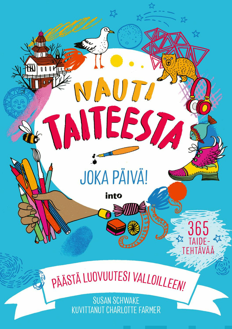 Piirrä omakuva, maalaa unelmiesi puumaja, keksi mielikuvituseläin, tee kollaasi ja kokeile eri taidesuuntien tapoja luoda taidetta. Nauti taiteesta joka päivä! sisältää 365 innostavaa tehtävää, jotka houkuttelevat tarttumaan tussiin, kynään tai siveltimeen.