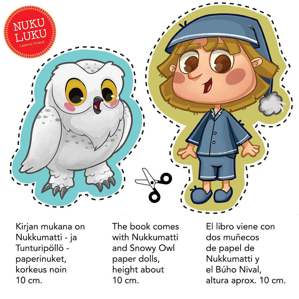 Kirjan takakannen muovitaskussa on paperiarkki, josta voi leikata irti kaksi paperinukkea, Tunturipöllö ja Nukkumatti (korkeus n. 10 cm).