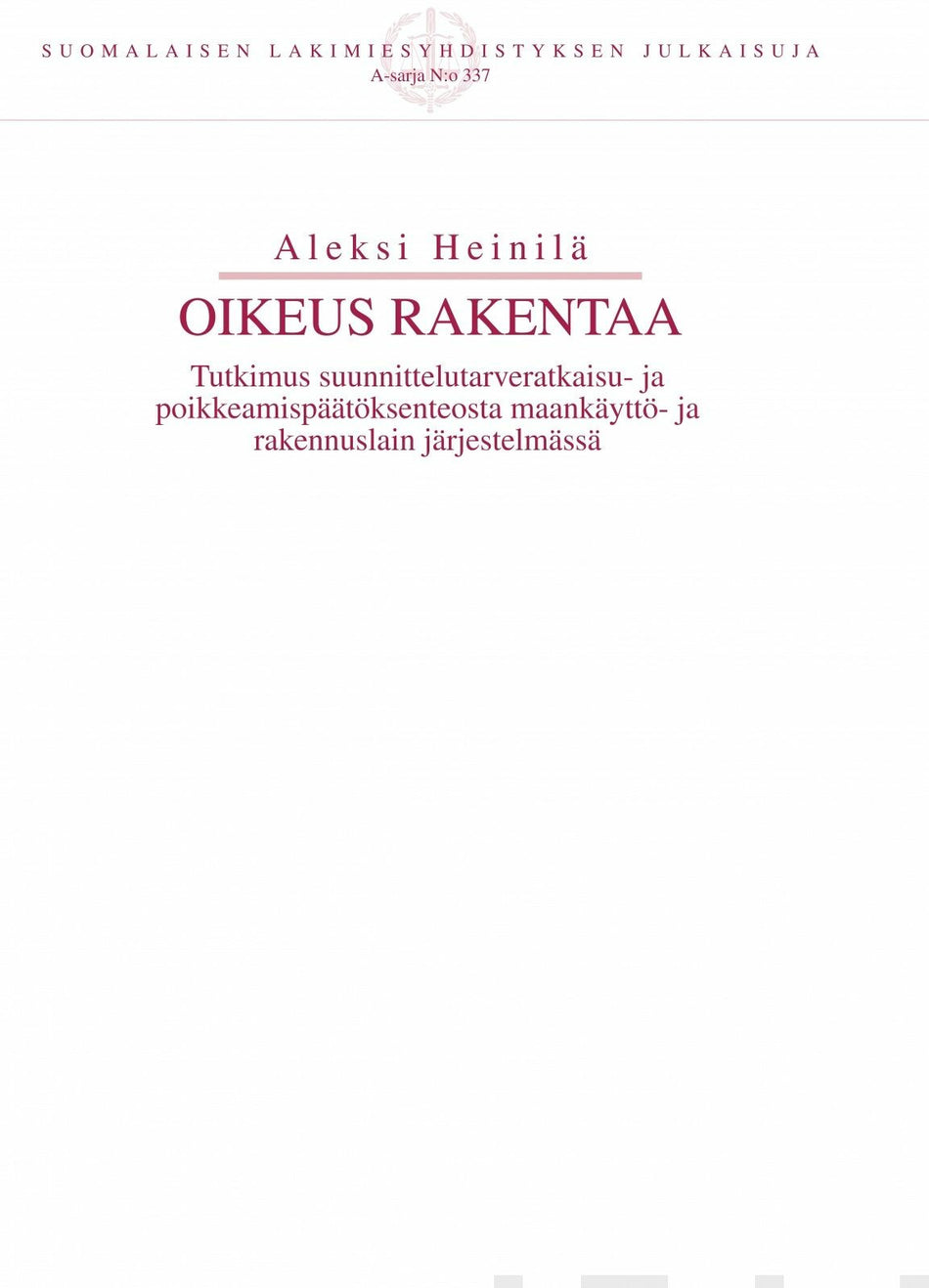 Tutkimuksen aineellisoikeudellinen teema on, missä menettelyissä ja millä edellytyksin rakentaminen on erityyppisillä, maankäyttö- ja rakennuslain (132/1999, MRL) säännösten määrittelemillä alueilla voimassa olevan oikeuden mukaan mahdollista. Tätä kysymystä tarkastellaan lain sisältämistä maankäytön suunnittelun tarvetta ja suunnitteluvelvollisuuksia koskevista säännöksistä lähtien. Tarkastelu keskittyy näihin liittyviin yksittäistapauksellisiin lupamenettelyihin, MRL 137 §:n mukaiseen suunnittelutarveratkaisuun ja MRL 171 §:n mukaiseen poikkeamismenettelyyn,jotka ovat osoittautuneet ongelmallisiksi niin oikeudellisesti kuin käytännössäkin. Tutkimuksen näkökulma kiinnittyy maankäyttö- ja rakennuslain systematiikkaan ja tavoitteisiin, ja kyse on paljolti siitä, minkälaiselle perustalle laki itse rakentuu, mitä puheena olevat lupamenettelyt ovat ja mitä ne merkitsevät lain systematiikalle ja sen tavoitteille. Maankäyttö- ja rakennuslakiin kohdistuu sen yhteiskunnallisen merkityksen vuoksi jatkuvia muutospaineita. Tämä korostaa systemaattisen tarkastelun tärkeyttä.