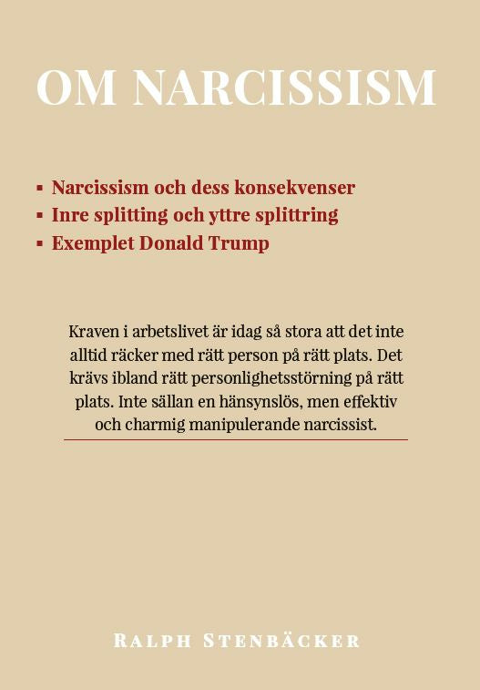 Boken belyser narcissism i olika former, både naturlig, frisk narcissism, kulturellt betingad narcissism (en kantring i våra personligheter utifrån det västerländska samhällets fokus på individualism, egoism och självförverkligande, på bekostnad av gemenskap och solidaritet), samt Narcissistisk p... Lue lisää