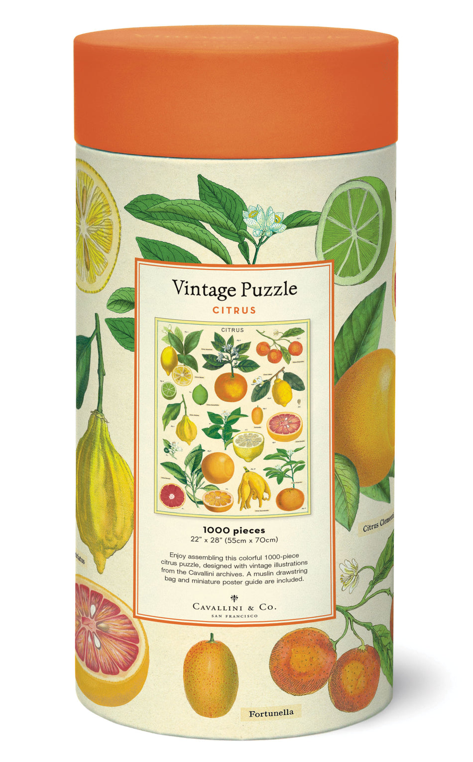 Vintage-aiheinen 1000 palan palapeli kauniissa pakkauksessa. Palapelin kuva-aiheena sitrushedelmät. Kalifornialainen Cavallini & Co on valmistanut Vintage-aiheisia tuotteita jo 25 vuoden ajan. Kuva-aiheet ovat peräisin yhtiön perustajan laajoista kuva-arkistoista, joita hän on koonnut jo laps... Lue lisää