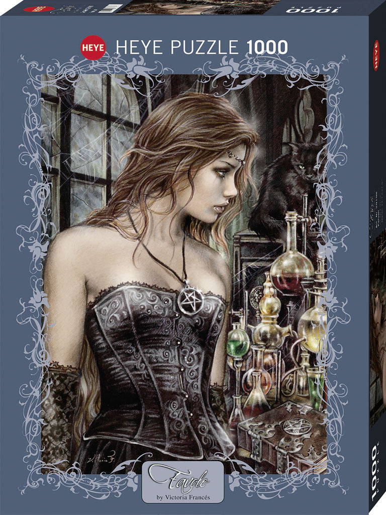 Victoria Francésin hyvin varustellussa noitakeittiössä musta kissa valvoo tarkasti, että kaikki sekoitetaan paksun loitsukirjan reseptien mukaan. Palapelin koko noin 50x70cm.
