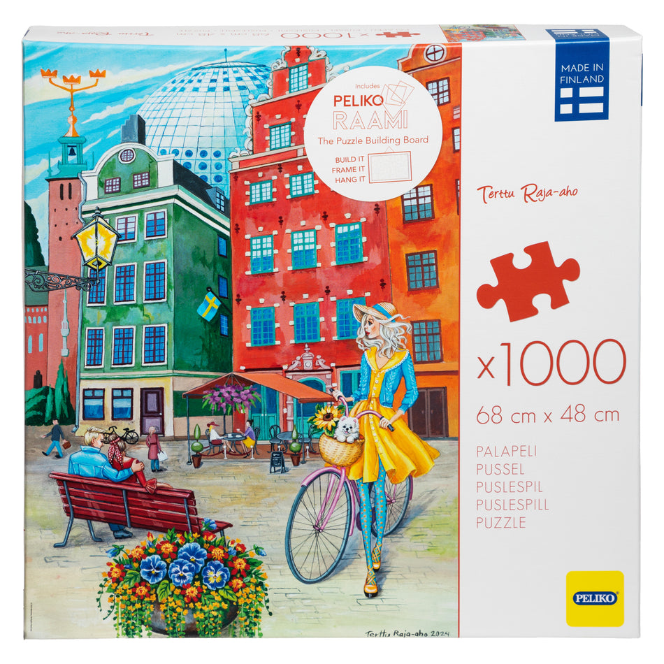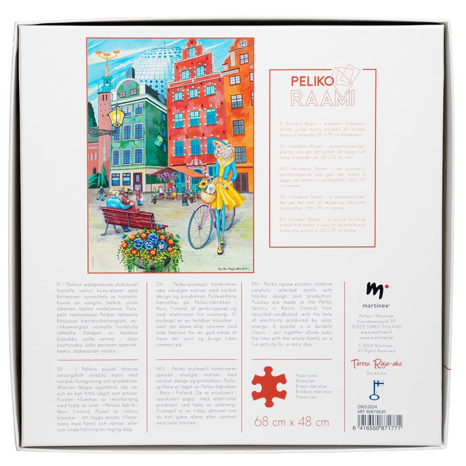 Suomalaisen taiteilijan Terttu Raja-Ahon luoma upean värikäs ja yksityiskohtainen kuva on osa kaupungit-kuvasarjaa. Neitokainen keltaisessa kesämekossa on lähtenyt päiväkävelylle Tukholmaan idylliseen vanhaan kaupunkiin. Pieni koira matkustaa mukavasti polkupyörän korissa. Pelikon palapelit valmistetaan Suomessa kierrätyskartongista, aurinkoenergian voimalla tuotetulla sähköllä. Valmiin palapelin koko on 68 x 48 cm. Sisältää Peliko Raamiin – kokoamisalustan, jonka avulla palapeli on helppo koota ja kehystää mihin tahansa standardikokoiseen 50x70 cm kehykseen.